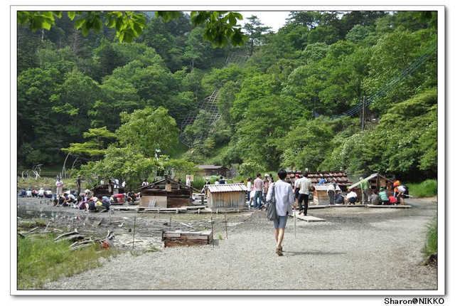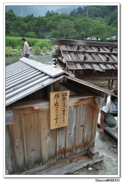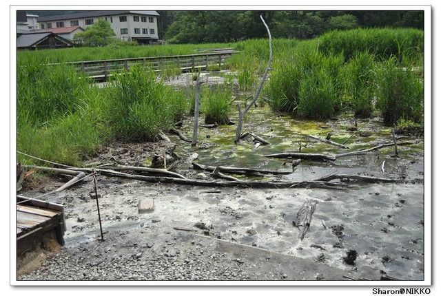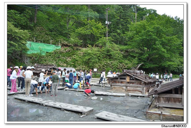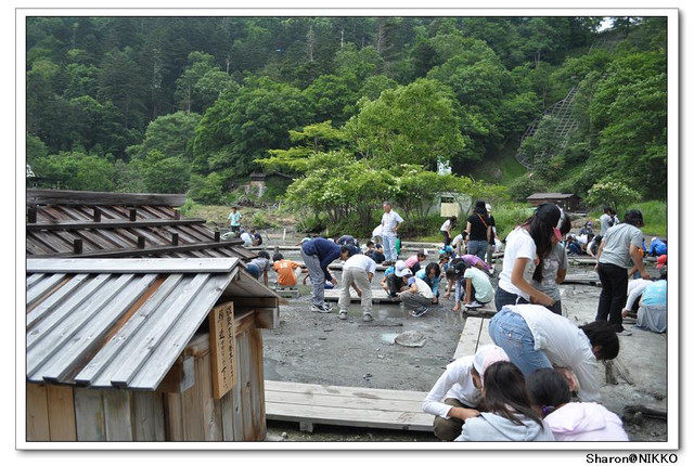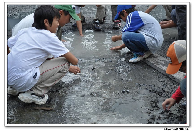 我們來晚了一步,源頭區早已被小學生攻佔,跟想像中不太相同,有點像是沼澤,而這些小朋友在幹嘛?!他們正在老師的指示下拿十元銅板放在溫泉,泉質中含有硫磺,經過化學作用,銅板會變成黑色,用木板搭的步道幾乎被小朋友佔領,無聊的我,很喜歡做這種反應的測驗,我故意站在步道上,一副無法前進的樣子,天曉得,這麼熱的天,我其實無意走進高溫的源頭,我只是想看看老師們的反應,果然,老師機會教育,教導小朋友不要擋到人家的路,造成別人的困惑,不要造成別人的困惑,應該是日本教育中很重要的一環吧!!