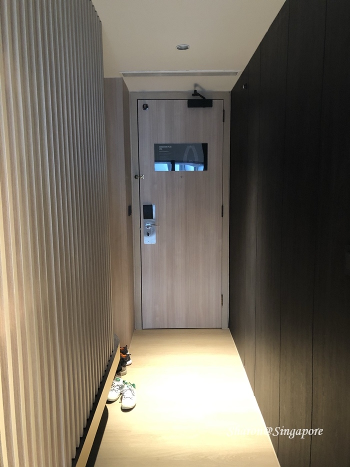 房間門口進來,用不同顏色的木窗及一片木牆,增加空間的變化