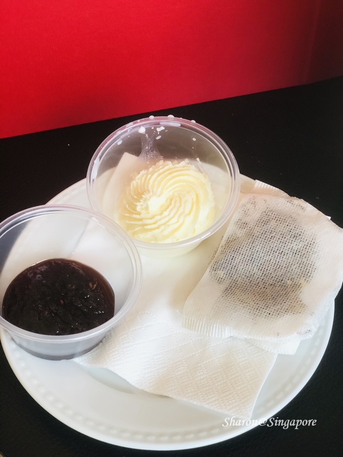 左邊是奶油及果醬,右邊那一包是茶包,自己要手動泡茶